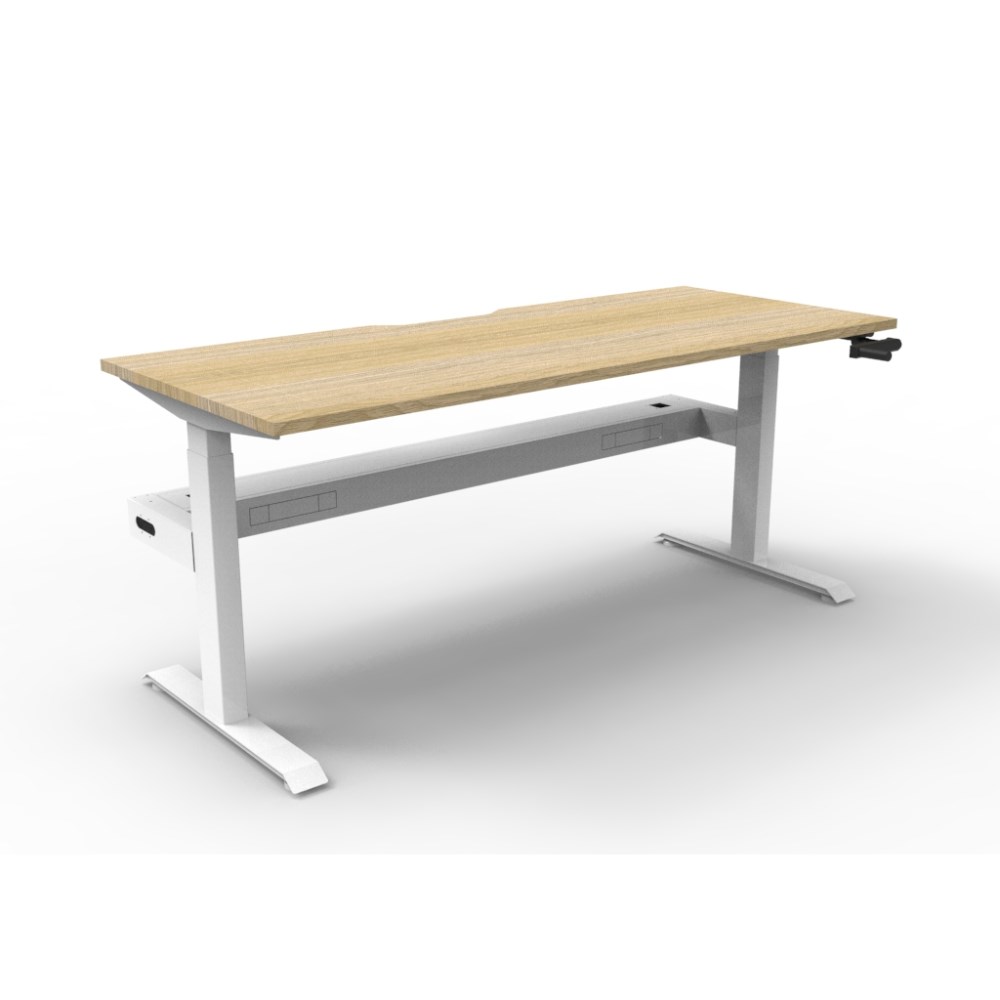 Rapidline Boost single sided manual crank height adjustable workstation with cable tray. Natural oak top with white frame.