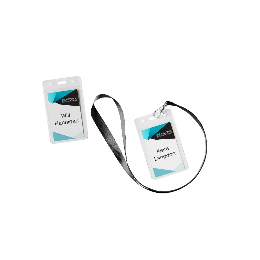 Kit contains 10 portrait orientation reusable badge holders, 10 lanyards (black), 2 sheets of 150gsm printable insert cards, each with 8 perforated name cards.
