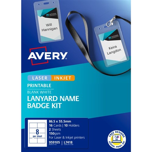 Avery Lanyard Name Badge Kit + Lanyards+Holders White L7418 86.5 x 55.5mm 8UP 16 Labels
