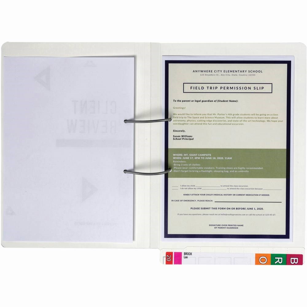 Installed with spiral spring transfer fastener to further secure documents.