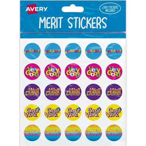 Avery Merit Stickers Caption 3 Round 22mm 5 Designs Assorted Colours 300 Stickers