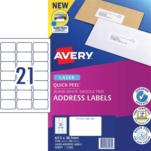 Avery Quick Peel Address Laser Labels White L7160 63.5x38.1mm 21UP 420 Labels 20 Sheets