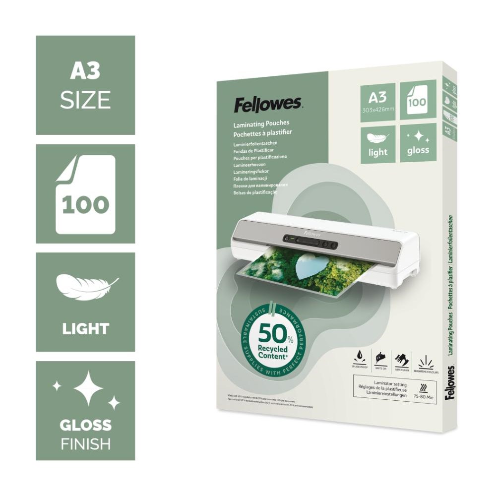 Fellowes Sustainable Laminating Pouches A3 75/80 Micron Gloss Pack Of 100