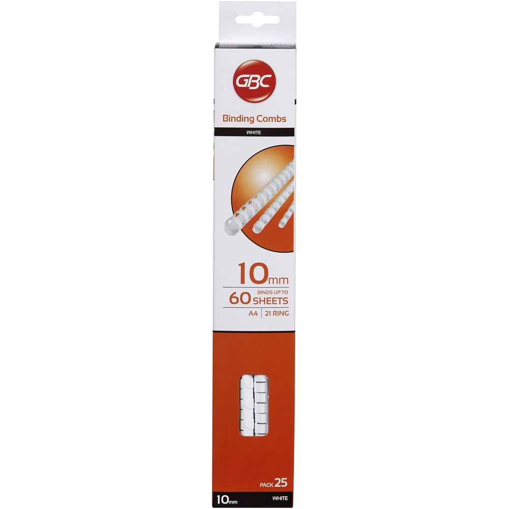 GBC Plastic Binding Comb 10mm 21 Loop 60 Sheets Capacity White Pack Of 25