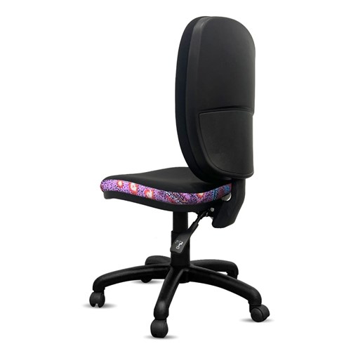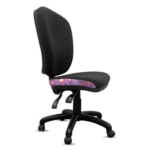 A unique commercial fabrics designed by Andrea Adamson (Indigenous Artist) combined with K2 Black Fabric to upholster the chair.