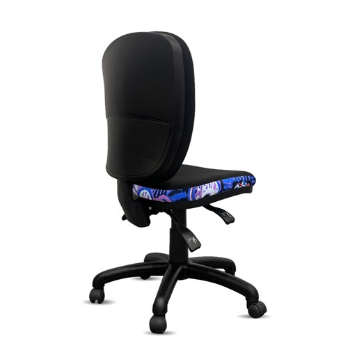 A unique commercial fabrics designed by Murdie Nampijinpa Morris (Indigenous Artist) combined with K2 Black Fabric to upholster the chair.