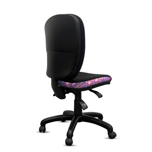 A unique commercial fabrics designed by Andrea Adamson (Indigenous Artist) combined with K2 Black Fabric to upholster the chair.