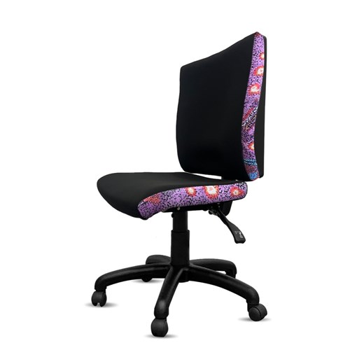 A unique commercial fabrics designed by Andrea Adamson (Indigenous Artist) combined with K2 Black Fabric to upholster the chair.