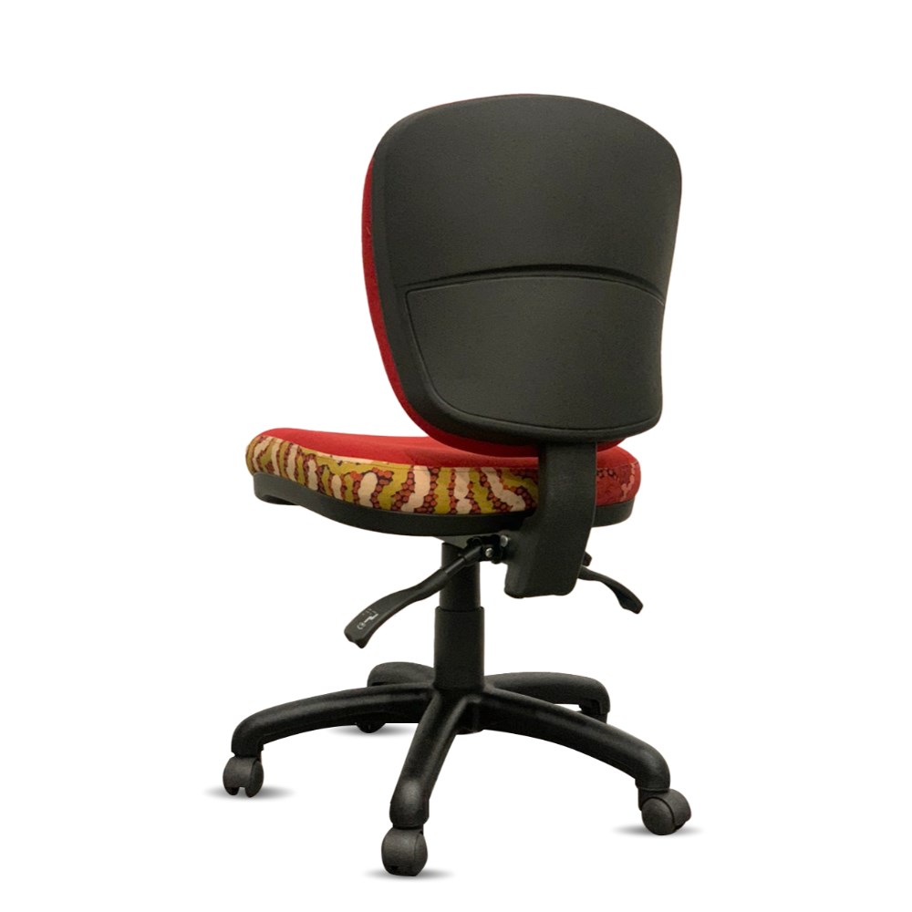A unique commercial fabrics designed by Damien and Yilpi Marks (Indigenous artists) combined with K2 Red Ochre Fabric to upholster the chair.