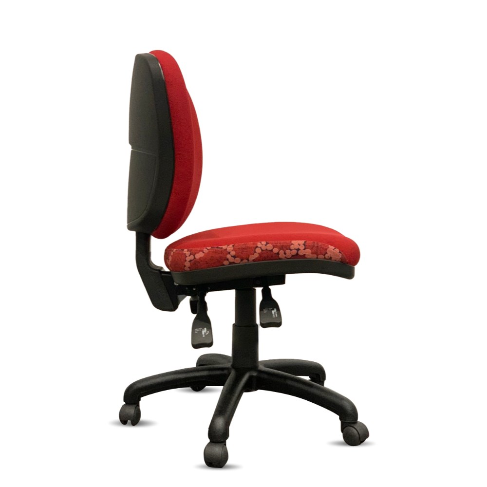 Heavy duty commercial chair with 3 lever mechanism and ratchet back height adjustment.
