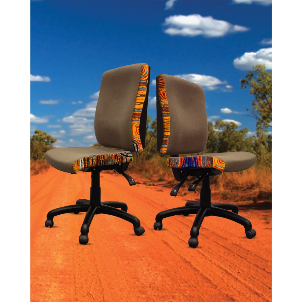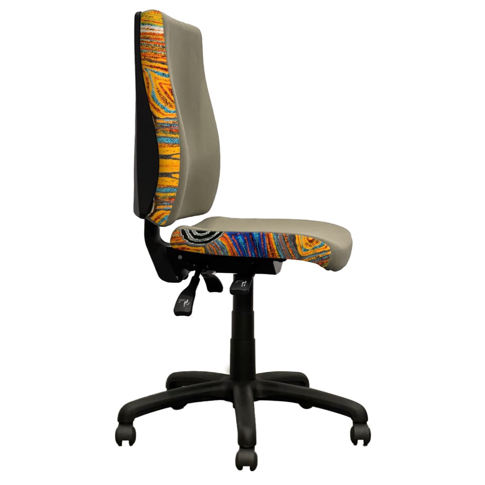 A unique commercial fabrics designed by Mary Napangardi Brown (Indigenous artist) combined with K2 Mist Grey Fabric to upholster the chair.