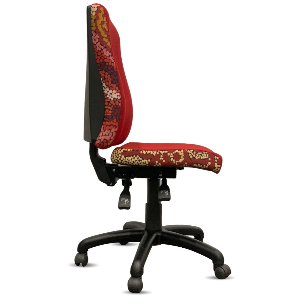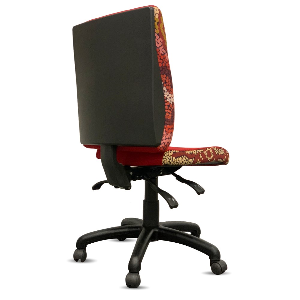 A unique commercial fabrics designed by Damien and Yilpi Marks (Indigenous artists) combined with K2 Red Ochre Fabric to upholster the chair.