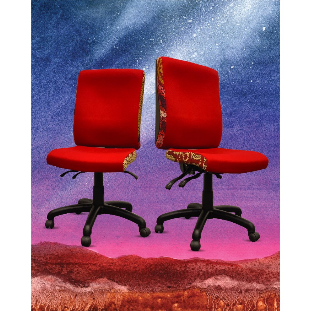 A unique commercial fabrics designed by Damien and Yilpi Marks (Indigenous artists) combined with K2 Red Ochre Fabric to upholster the chair.