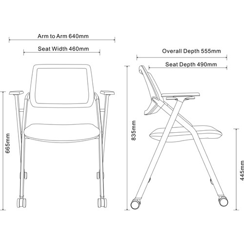 Arm To Arm: 640mm. Floor To Top Of Arm: 665mm. Overall Height: 835mm. Overall Depth: 555mm.