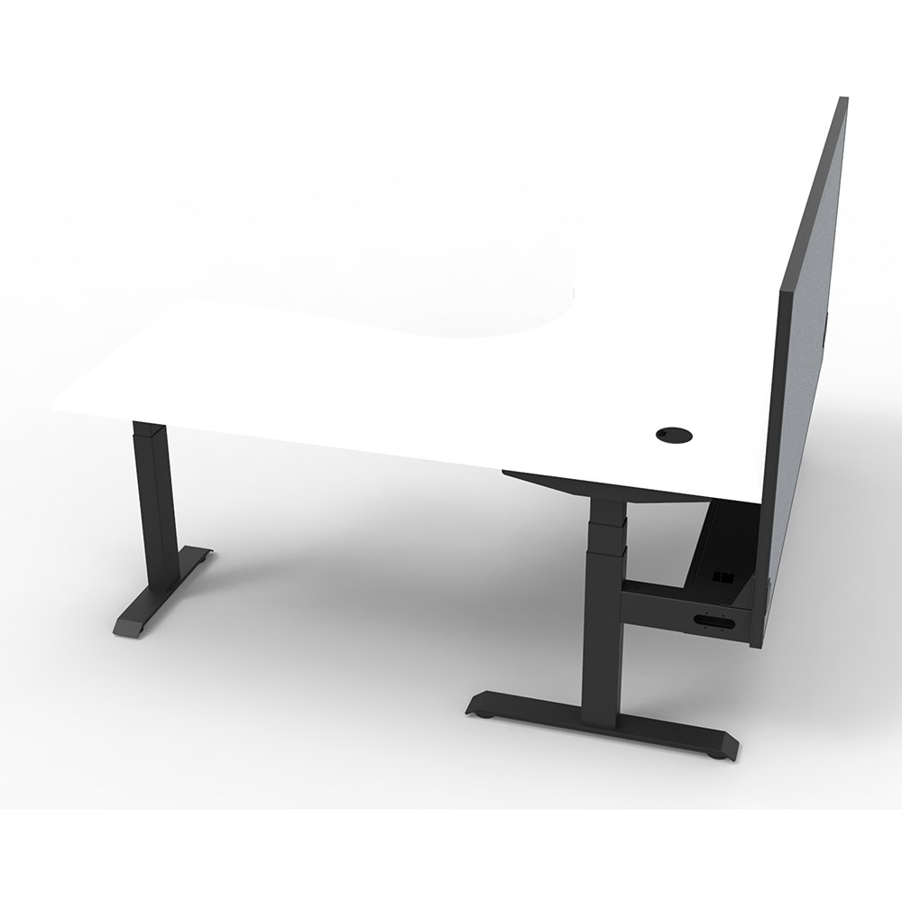 Dual Motor 3 stage motorised legs. Corner Workstation with Cable Tray and Screen.