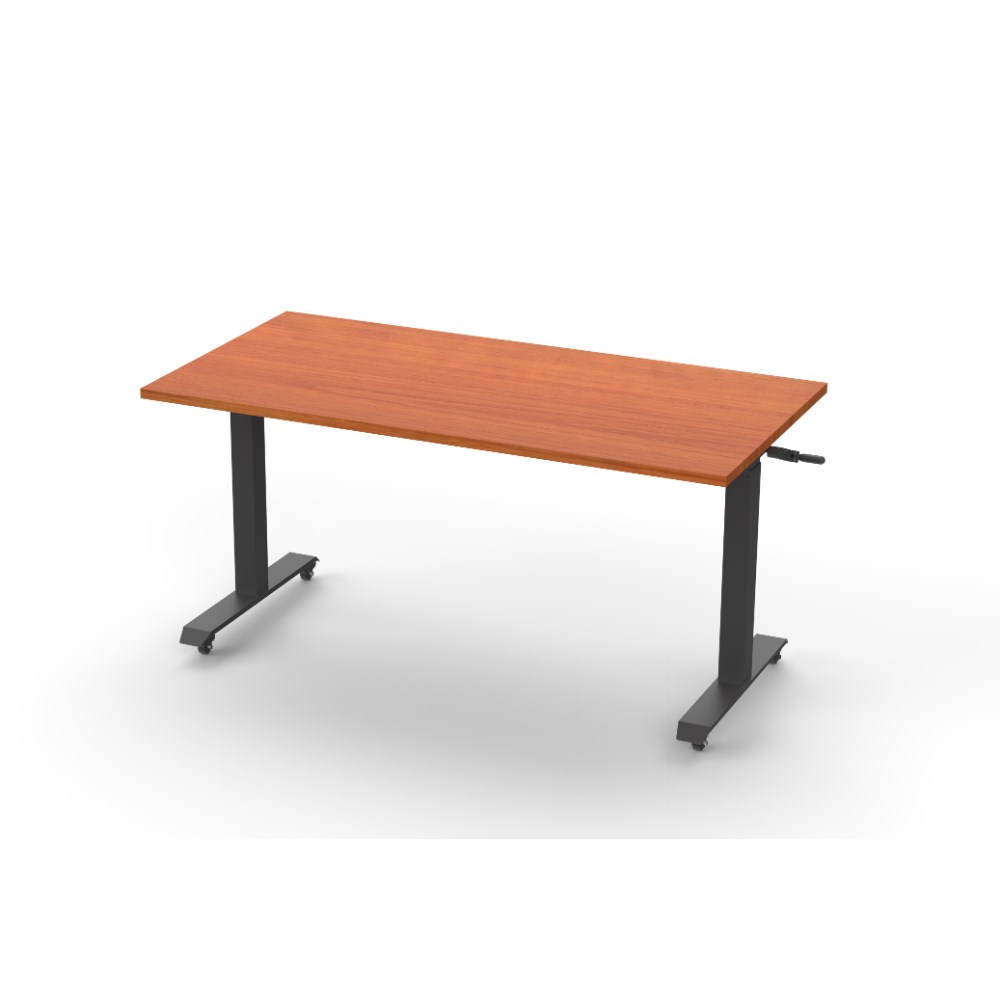 Rapidline Boost manual crank height adjustable flip top table. Cherry top black frame.