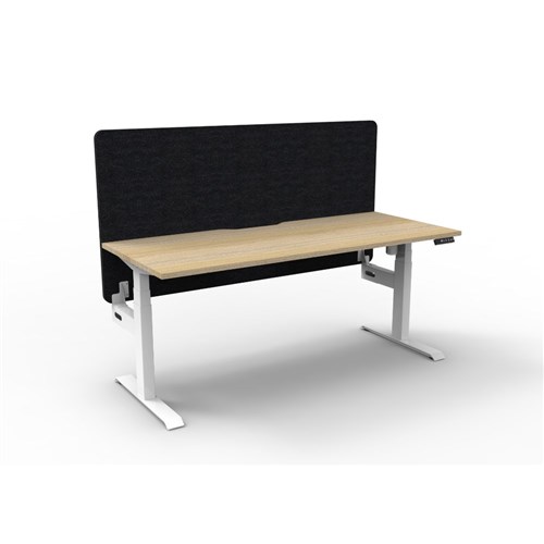 Electric height adjustable single sided workstation with Natural Oak top and White Satin frame, Black Eco screen.