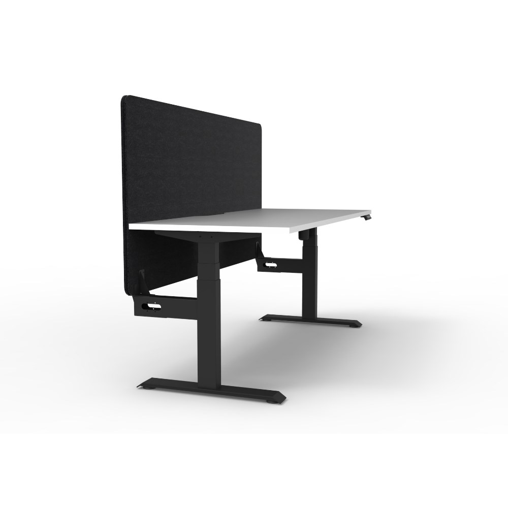 Electric height adjustable single sided workstation with Natural White top and Black Satin frame, Black Eco screen.