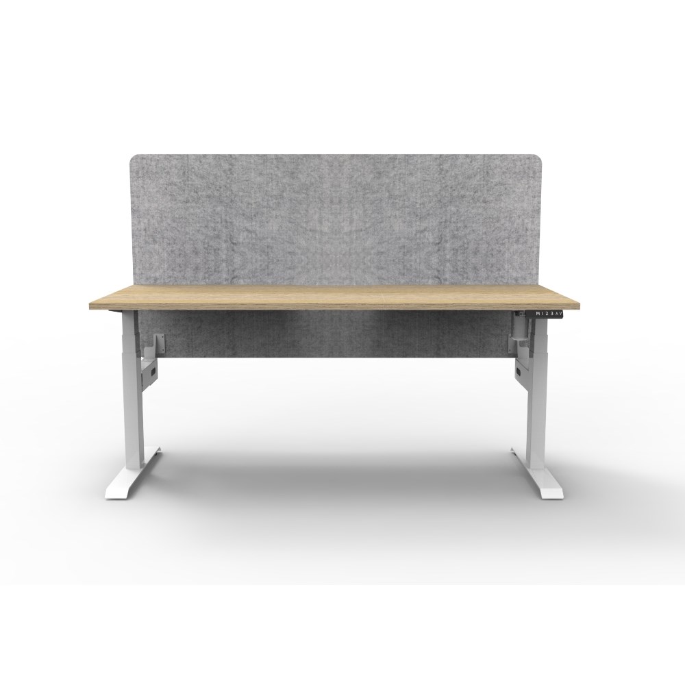 Electric height adjustable single sided workstation with Natural Oak top and White Satin frame, Grey Eco screen.
