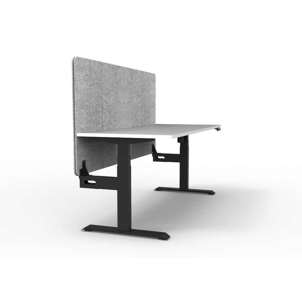 Electric height adjustable single sided workstation with Natural White top and Black Satin frame, Grey Eco screen.