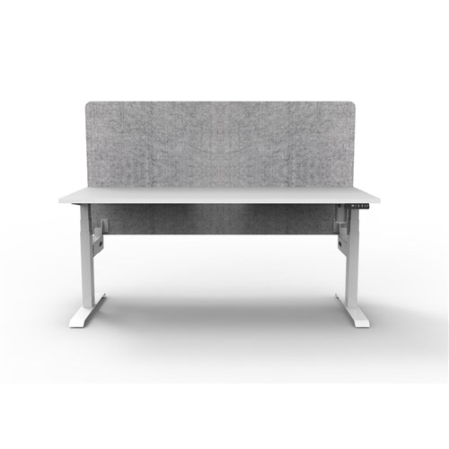 Electric height adjustable single sided workstation with Natural White top and White Satin frame, Grey Eco screen.