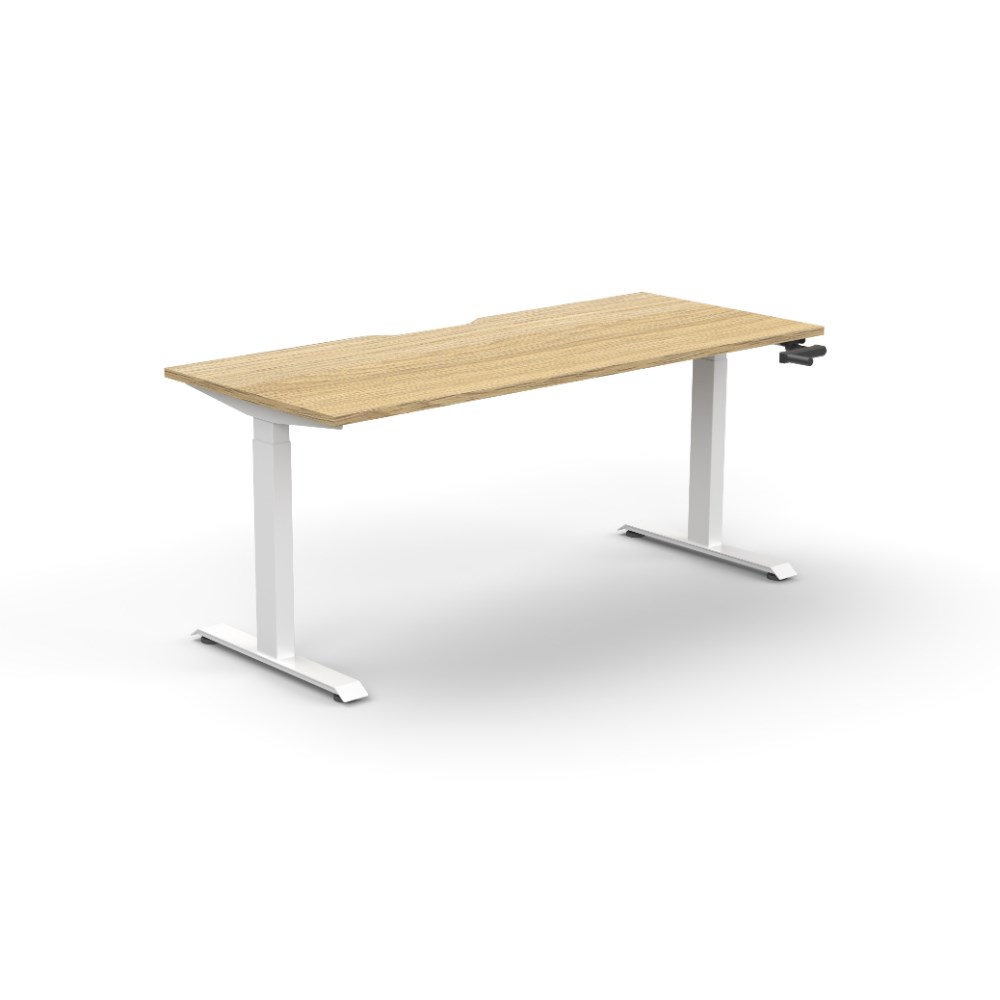 Rapidline Boost single sided manual crank height adjustable workstation. Natural oak top with white frame.