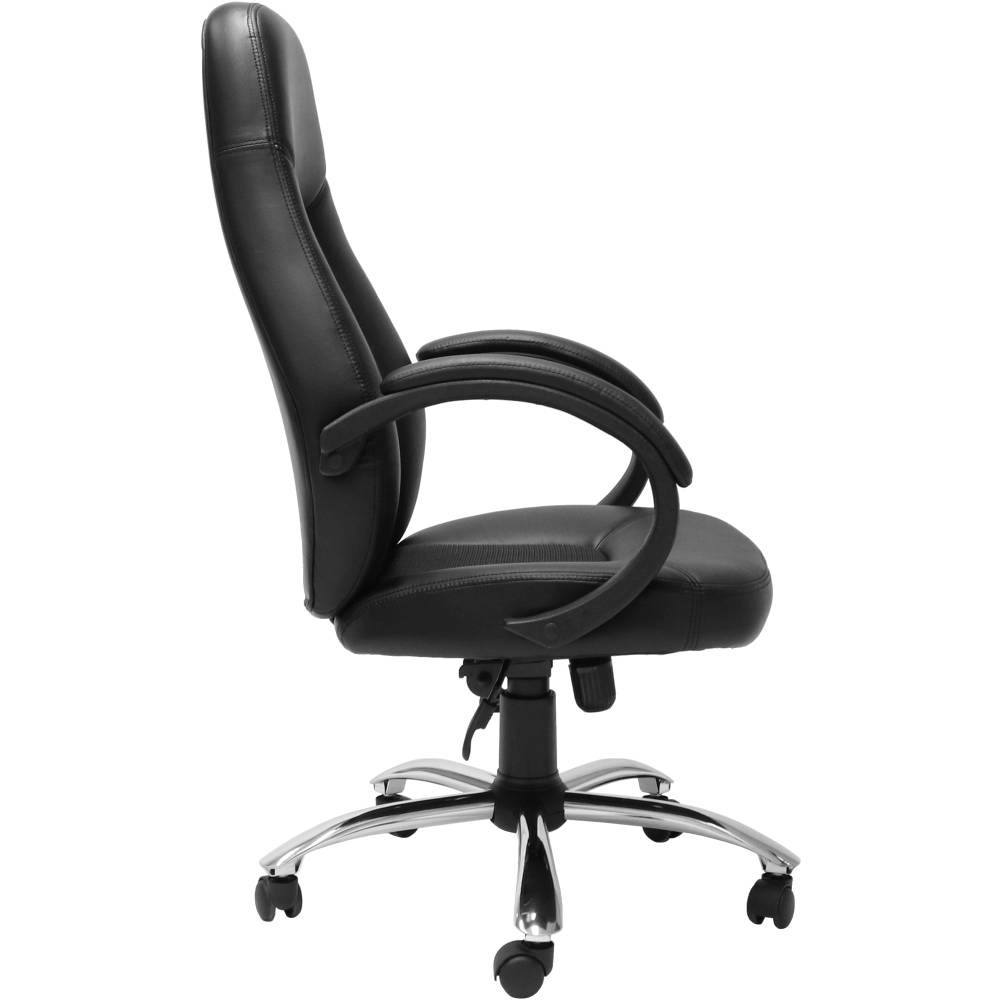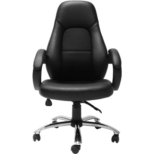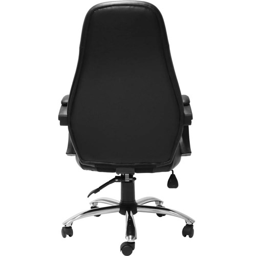 Executive high back chair with fabric inlay for extra comfort, chrome base and upholstered arms.