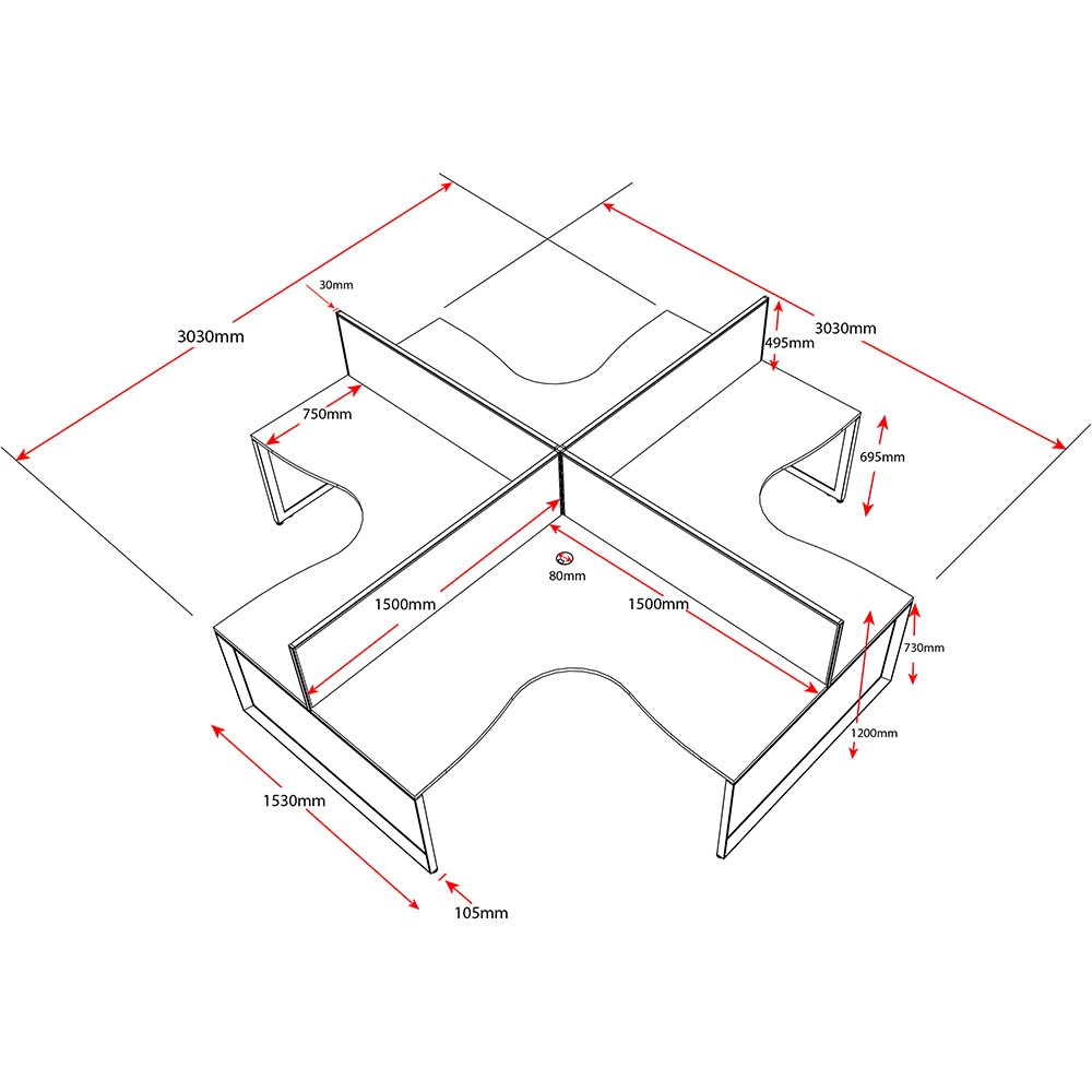 Overall Including Screen: 3030mm W x 3030mmW x 780mm D x 1200mm H. Per User: 1500mm W x 1500mmW x 750mm D. Desk Height: 730mm.