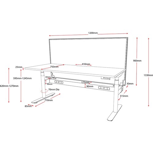 70mm diameter round column legs. 700mm wide foot size with adjustable leveling feet, return foot: 700mm. Comes with 30mm thick privacy screens and cable tray for cable management.