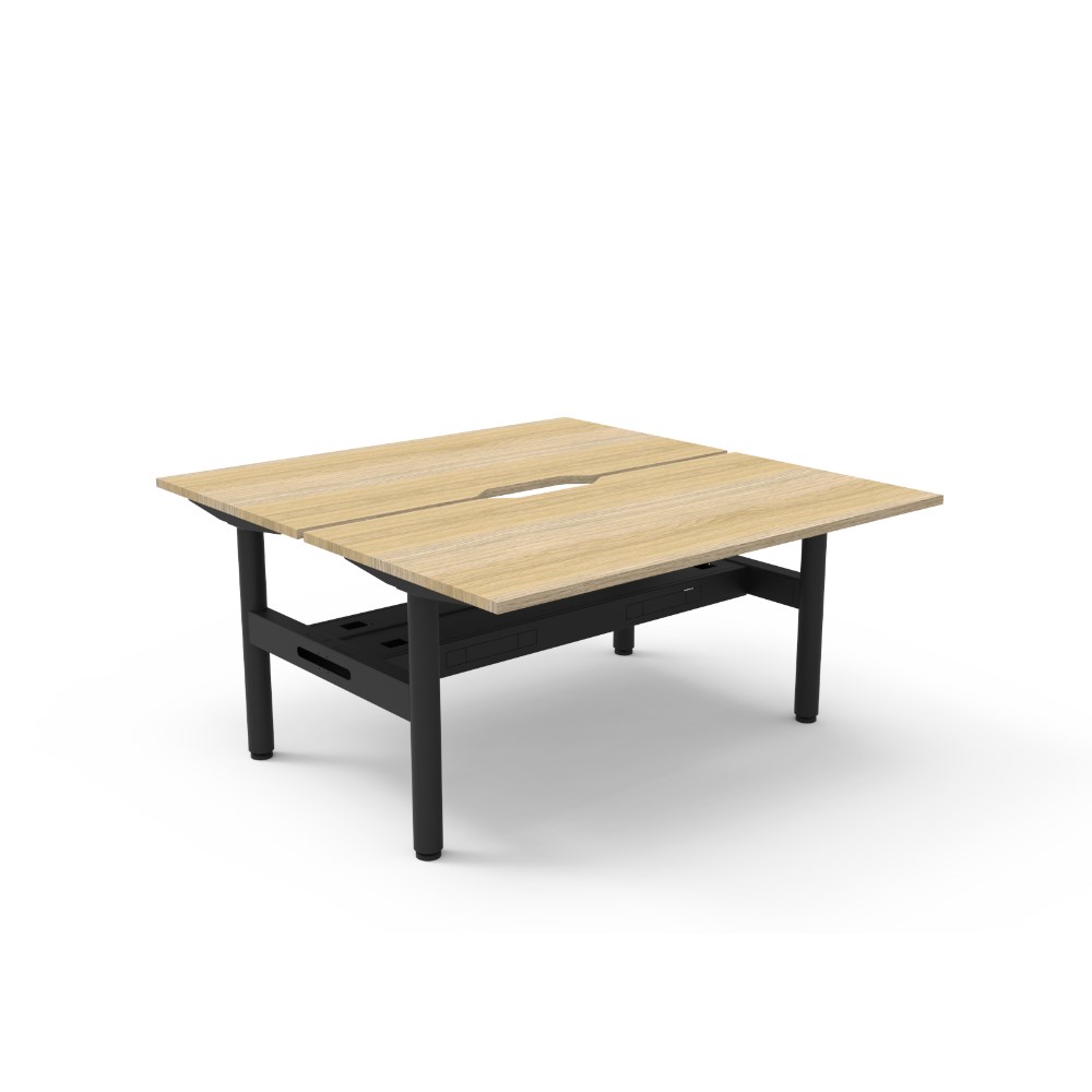 Natural Oak top Black Satin frame. Double sided workstation with cable tray.