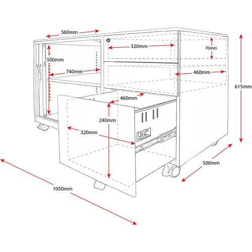Internals: Tambour Size 560W x 740D x 500H, Top two drawers 320W x 460D x 70H, Bottom filing drawer 320W x 460D x 240H.
