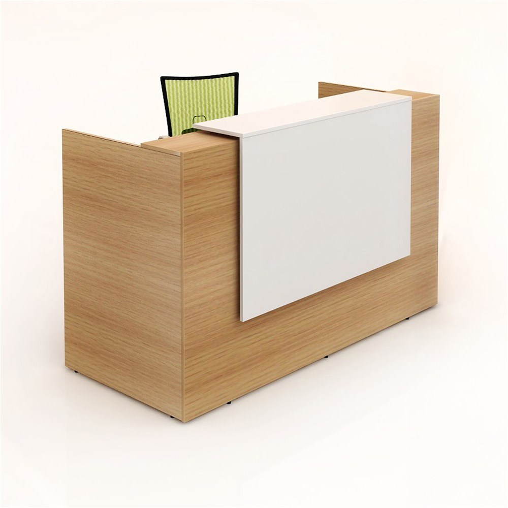 Modern simple designed reception counter finished in Beech Melamine front and side panels with Gloss White feature panel and Matt White Melamine desktop.