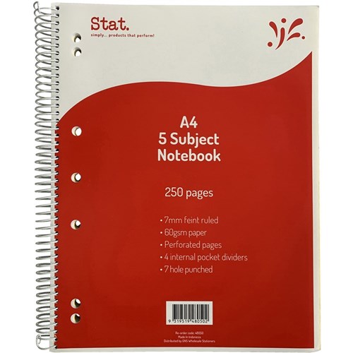 Stat 5 Subject Notebook Spiral A4 7mm Ruled 60gsm 250 Page Red