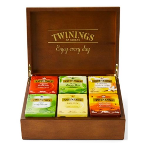 6 compartments contains a combination of teas in a uniquely crafted wooden box including: English Breakfast, Pure Peppermint, Pure Green, Earl Grey, Camomile Honey and Australian Afternoon tea.