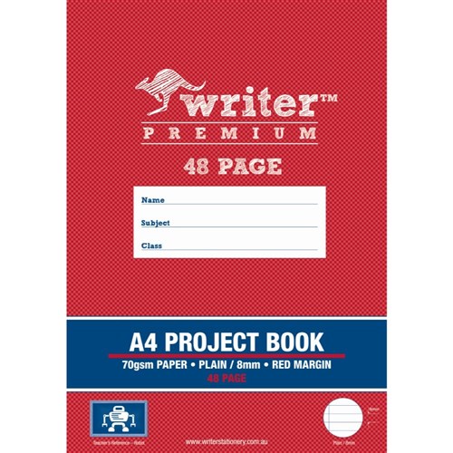 Writer premium exercise books feature heavy duty covers, high quality white 70gsm paper with 8mm ruled lines and a red margin on one side and plain page on the other..